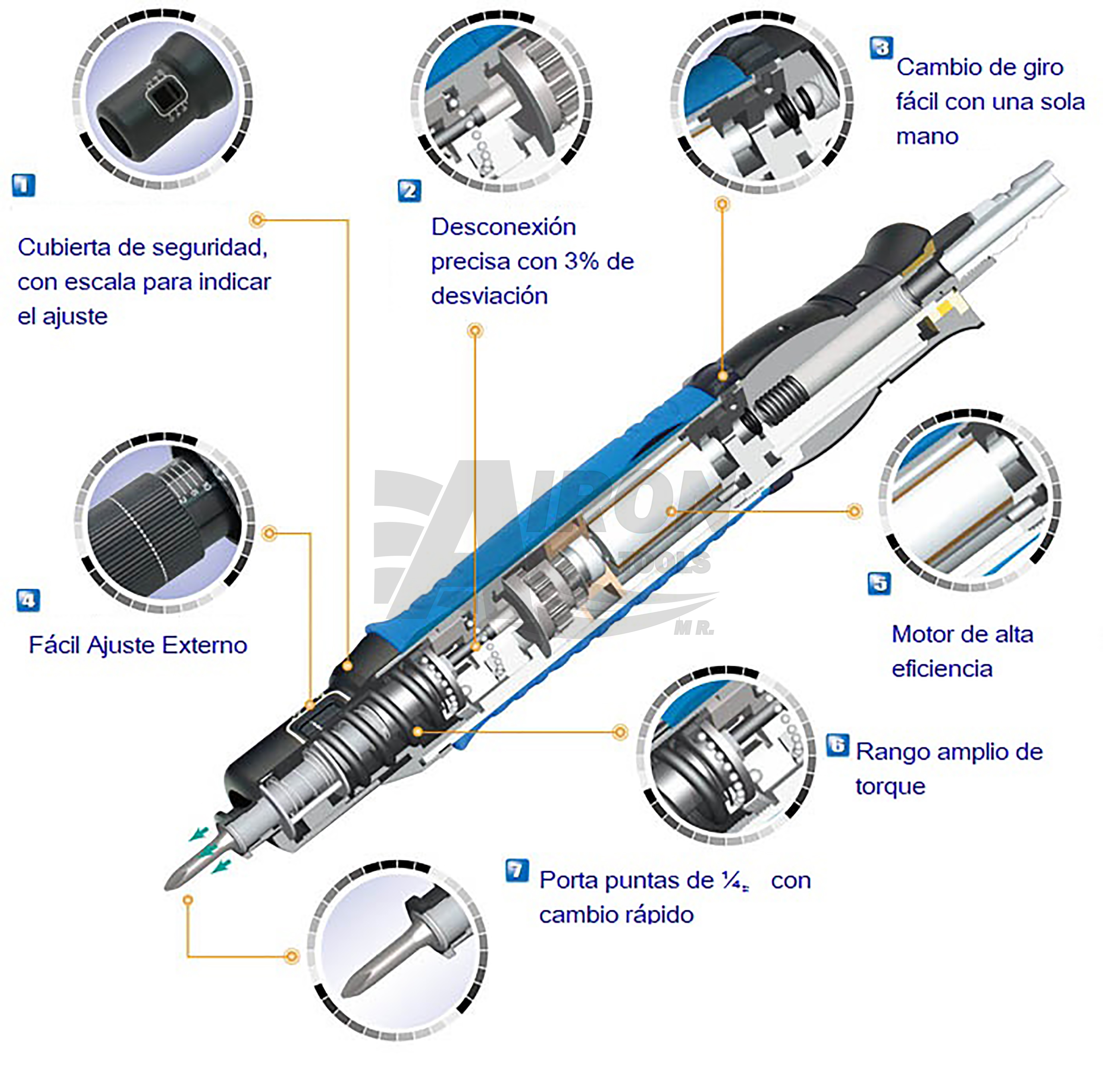 El embrague de control de torque y desconexión automática de AIRON TOOLS corta la potencia rápidamente cuando se ha alcanzado el par de torsión exacto. Alcanza su precisión gracias a la acción de balanceo y baja fricción del embrague junto con la desconexión síncrona del aire. Estas características se combinan para dar una repetibilidad menor ± 3 %.